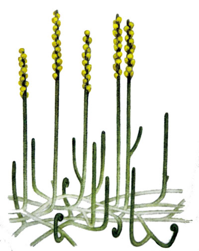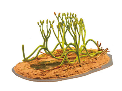 另外,还有一类孢子囊聚集成丛状,着生于茎轴末端的植物,它们与工蕨类和石松类保存在相同时期的地层中,在演化上具有重要意义,因为它们可能代表了种子植物的先驱。这种植物中不具叶的代表就是所谓的三枝蕨类植物,而具有叶的植物则为典型的早期真蕨类植物或古羊齿类植物。