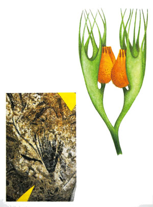 最早具有种子的植物的化石(左)以及生殖部分复原图(右),位于中部的壳斗长约13毫米,存在于晚泥盆世