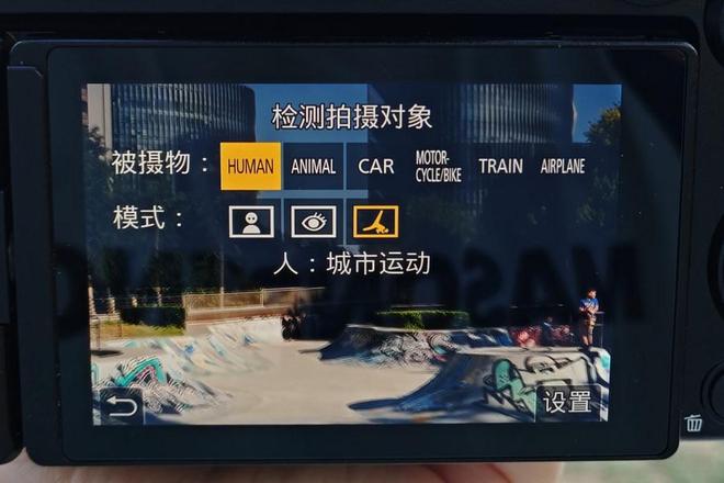松下LUMIX S1M2支持AI对焦识别技术,包括⼈类(眼睛、⾯部、⾝体、城市运动)、动物、汽⻋、摩托⻋/⾃⾏⻋、⽕⻋、⻜机识别,尤其是人物识别中还新增了全新的“城市运动”识别功能,可以更智能识别滑板、跑酷等户外运动的被摄对象。